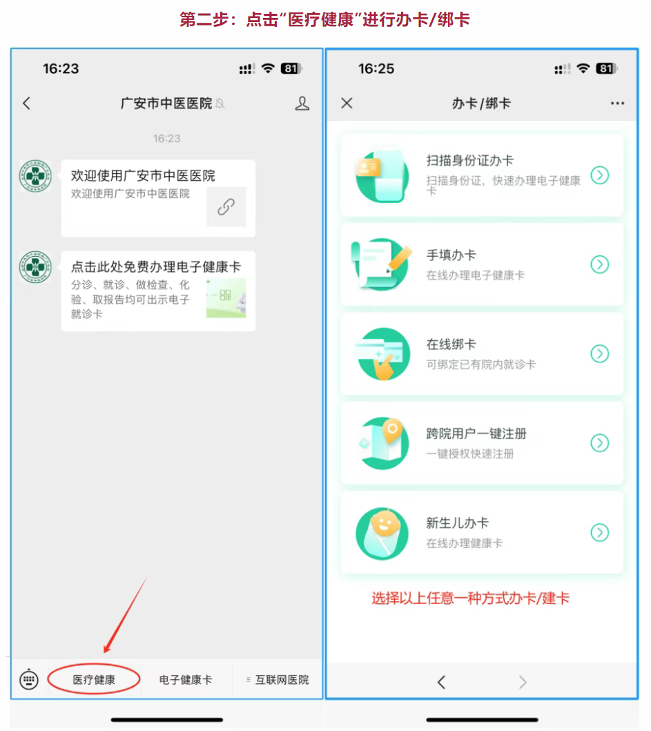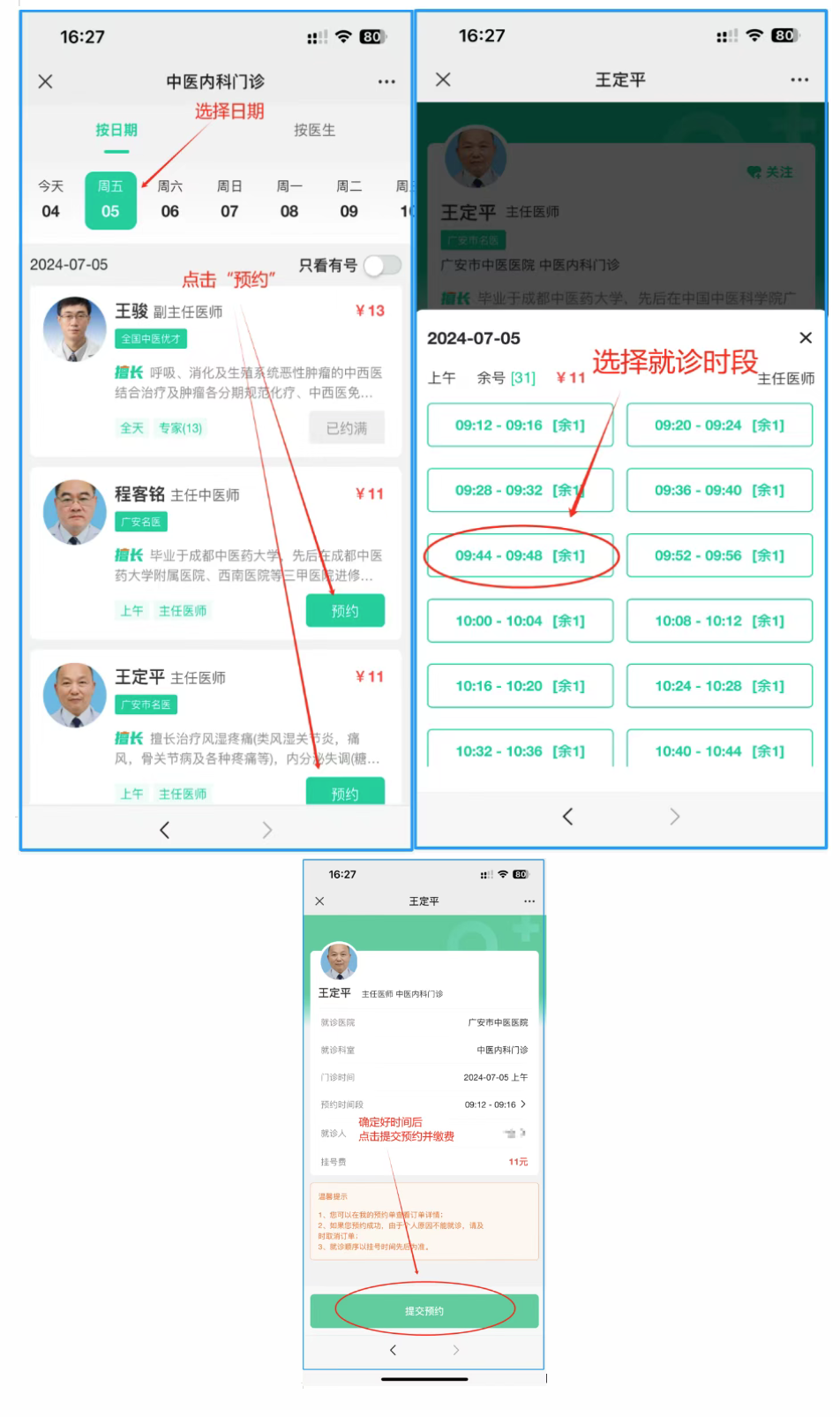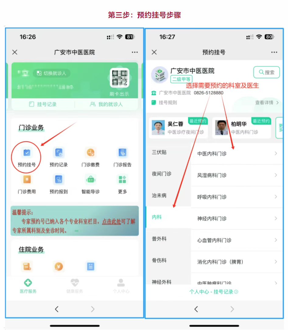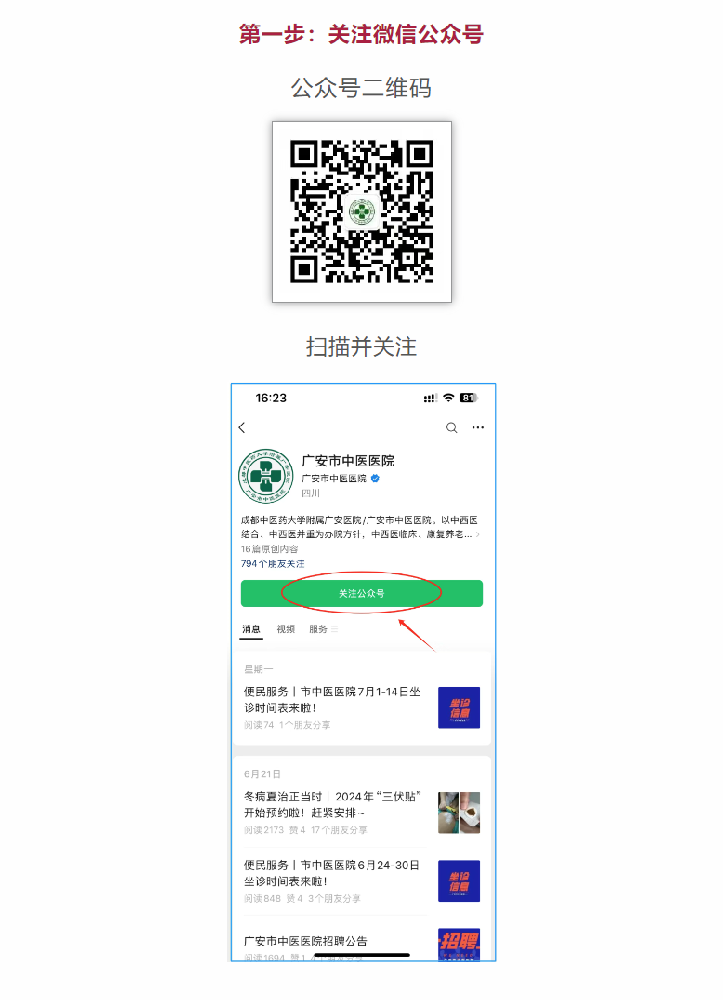 注:大厅窗口挂号只能选择当日号源,如需预约请在“广安市中医医院公众号”进行预约挂号。
