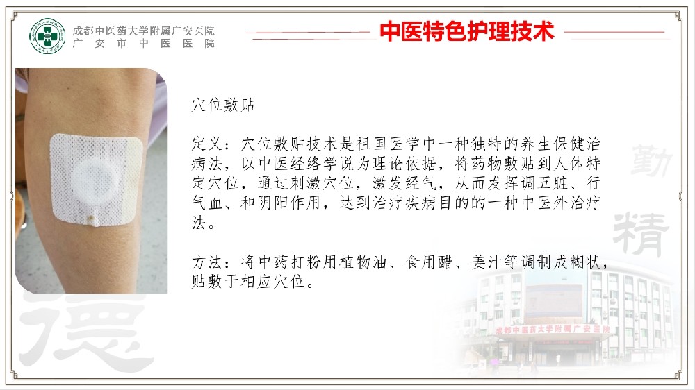 穴位敷贴 定义:穴位敷贴技术是祖国医学中一种独特的养生保健治 病法,以中医经络学说为理论依据,将药物敷贴到人体特 定穴位,通过刺激穴位,激发经气,从而发挥调五脏、行 气血、和阴阳作用,达到治疗疾病目的的一种中医外治疗 法。 方法:将中药打粉用植物油、食用醋、姜汁等调制成糊状, 贴敷于相应穴位。