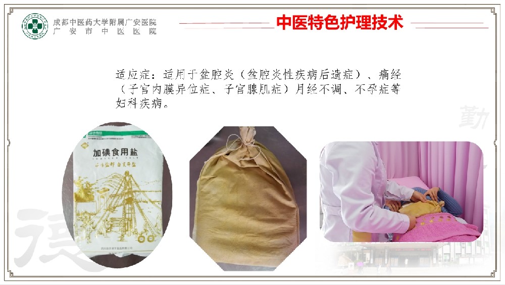 适应症:适用于盆腔炎(盆腔炎性疾病后遗症)、痛经 (子宫内膜异位症、子宫腺肌症)月经不调、不孕症等 妇科疾病。